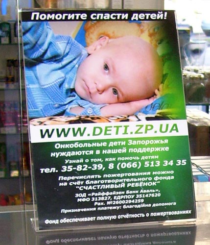 Надеемся, что и другие запорожские банки, магазины, фирмы, аптеки, промышленные предприятия, учебные заведения, церкви разместят у себя информационные материалы о помощи сиротам и онкобольным детям Запорожья. Наш фонд в любое время готов предоставить для этого свою печатную продукцию. Справки по телефону +3 8 066 513 34 35 (Альберт), detizp@mail.ru