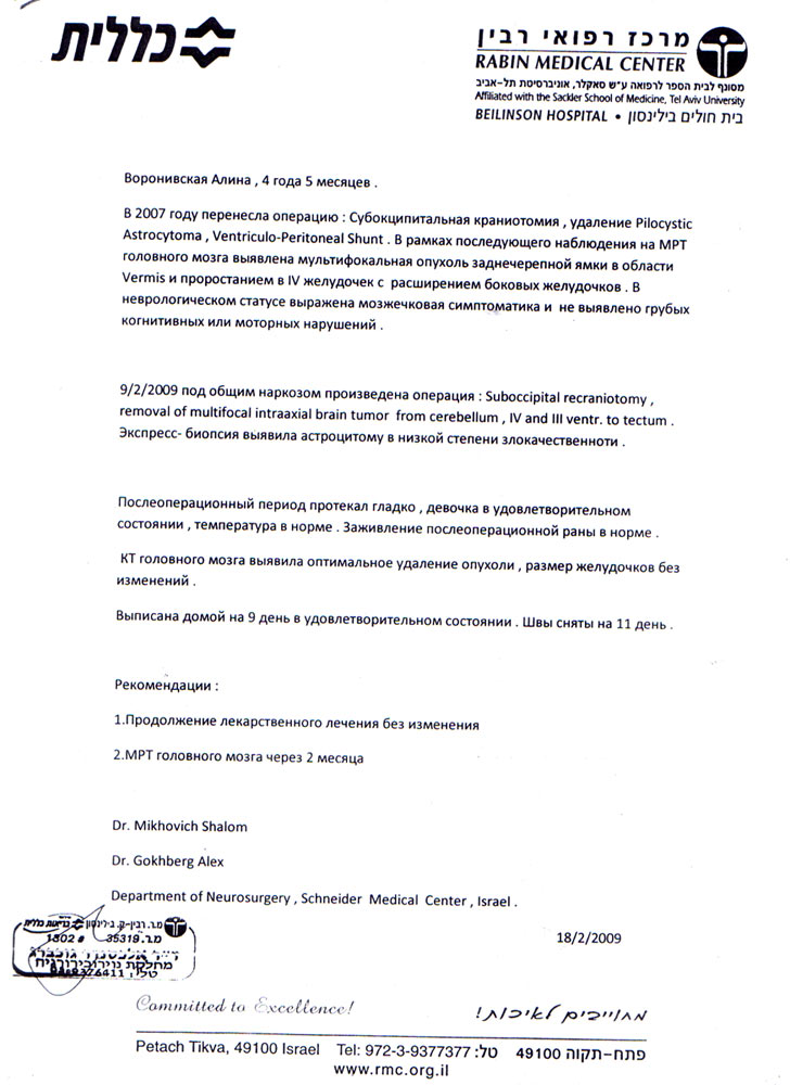 Несмотря на то, что в нескольких клиниках России, Германии и Израля врачи отказались удалить опухоль Алине из-за расположения ее в труднодоступном месте, родители решили продолжать бороться с болезнью. Они не оставили поиски и нашли клинику в Израиле, которая обладает и необходимым современным нейрохирургическим оборудованием, и достаточным опытом в удалении подобных опухолей. В итоге в нейрохирургическом отделении израильской клиники Schneider Medical Center Алинке было оптимально удалено новообразование.