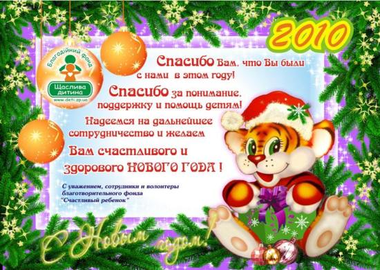 Дорогие наши друзья, наши неоценимые помощники и единомышленники! Сотрудники БФ "Счастливый ребенок" присоединяются к поздравлению веселого тигренка и хотят напомнить Вам, как много добрых дел Вы успели сделать в этом году: у многих детей Запорожской области появился шанс изменить свою жизнь, шанс жить без боли, страха и неизвестности, а у некоторых - даже просто шанс выжить. И это все благодаря неоценимой помощи наших уважаемых жертвователей!