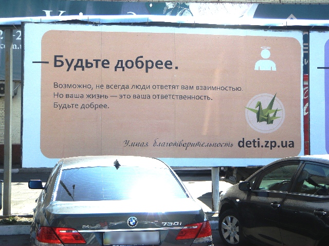 На автостоянке перед универмагом «Украина» появилась необычная реклама. Необычна она тем, что не призывает ничего покупать, не информирует о скидках, да и вообще ничего не просит для себя. Напротив, она «отдает», призывая людей верить в себя, быть добрее, ценить семью и любить своих детей.