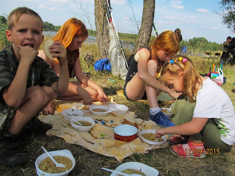 Свежий воздух и прогулка вдоль берега пробудили у юных рыбаков и рыбачек хороший аппетит. Полевая кухня с вкусными ухой и кашей оказались как нельзя кстати. Рыбацкий обед ребята уплетали с огромным удовольствием!