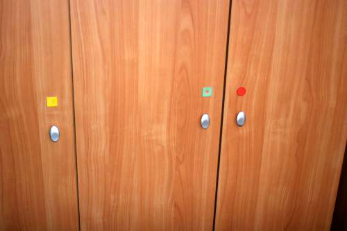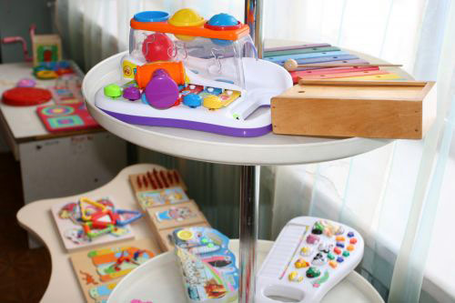 "Метка" у каждого ребенка своя - по выпуклой фигурке, наклеенной, например, на шкафчик, ребенок определяет, что именно этот шкафчик - его. Это придумали и воплотили сами педагоги. В садике нет телевизора по причине его ненужности. Дети занимаются в зале с музыкальным центром, на котором они слушают сказки, детские песни.