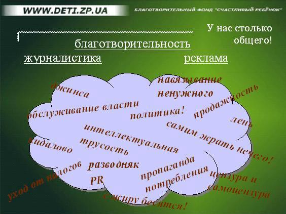 Немного поиграв в ассоциации мы с ребятами выяснили, что фонды, в основном, воспринимаются как способ легально вытаскивать деньги из чувствительных граждан и смысловой фон у слова "благотворительность" далеко не девственно белый. Из ассоциаций "джинса", "продажность", "политика" с понятием "журналистика" тоже создалось серовато-грязное смысловое облако, и никому не нужные сияли вдалеке понятия "правдивость", "точность", "мораль"... Деятельность рекламщиков оказалось не менее запятнанной... Вот и получилось, что у нас довольно много общего.