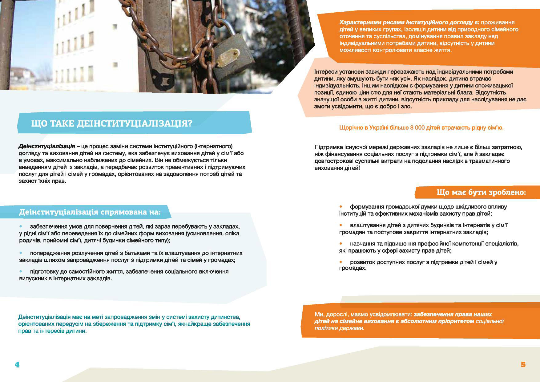 Європейська Комісія у своїх рекомендаціях національним урядам прямо закликає «зупинити експансію інституційної системи догляду за дітьми, які залишилися без піклування батьків, і сприяти запровадженню якісних послуг на рівні громади й родинних форм виховання, враховуючи думку самої дитини».