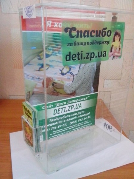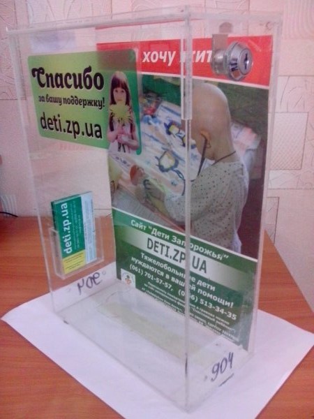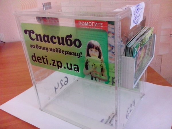 На фронтальной либо тыльной панели бокса обязательно размещается листовка с указанием организации, которая проводит сбор пожертвований – Благотворительный фонд «Счастливый ребенок». На некоторых указаны адрес сайта deti.zp.ua, контактный телефон, реквизиты фонда. Часть емкостей собирает пожертвования для конкретных детей. На таких емкостях размещены фотография и имя ребенка, для которого собираются средства.