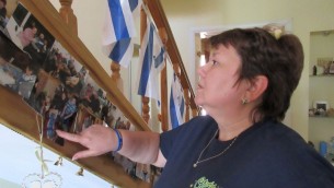 Natasha Kryzhanovsky, a Christians for Israel fieldworker, looks at photographs of some of the 2,800 Ukrainian Jews who have passed through the organization’s shelter on their way to Israel, May 4, 2017, Ukraine. (Sue Surkes)