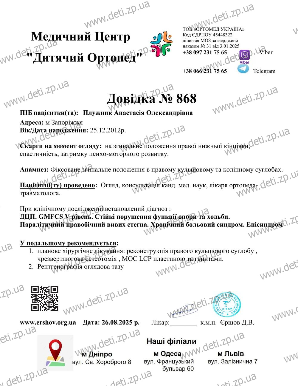 Recently, Anastasia’s condition sharply worsened: due to pathological muscle tone, she developed a hip dislocation. She cannot straighten her leg and experiences severe pain even at rest. Without surgery — femoral osteotomy with plate fixation — the situation will only worsen, whereas surgery will restore proper joint position and relieve her pain.