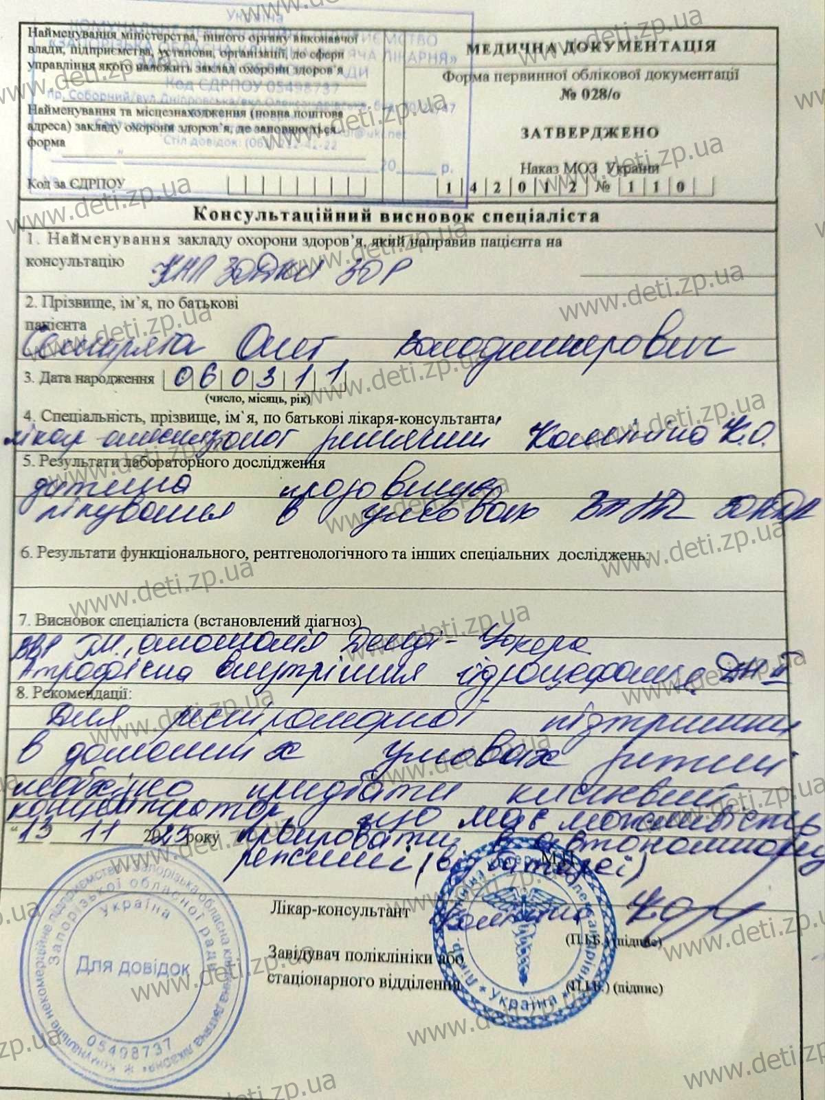 Oleh was born with congenital disorders that significantly affect the development of his nervous system and motor functions. Doctors diagnosed numerous serious conditions — Dandy–Walker malformation, hydrocephalus, spastic tetraparesis, epilepsy and portal hypertension. The full list of diagnoses takes up seven lines in the medical records.