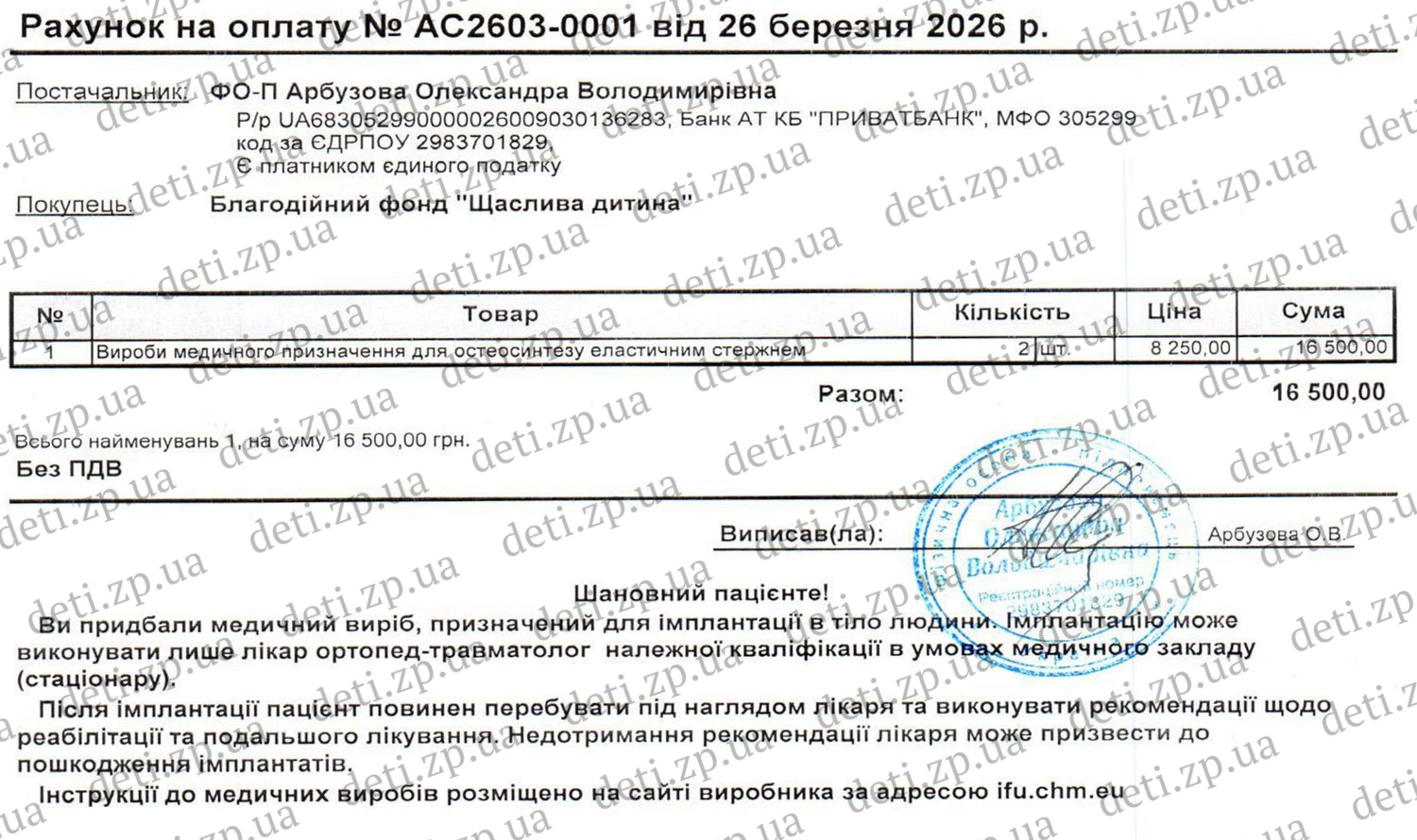 Для проведення операції терміново були потрібні імпланти. Нам вдалося домовитися з постачальником про відстрочку оплати, однак суму — 16 500 гривень — необхідно покрити.