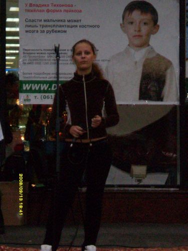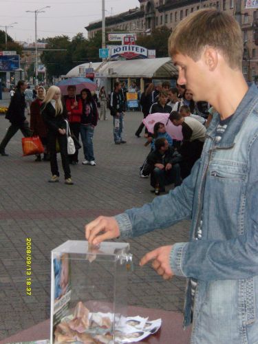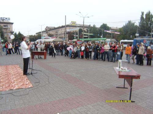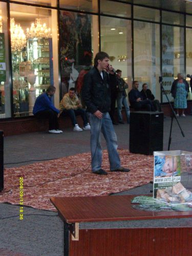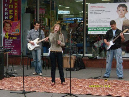 А на следующий день марафон продолжилась. Возле центрального универмага Запорожья снова состоялся уличный концерт. Нелегко было артистам удерживать внимание публики в то время, когда на улице дождь и каждый здравомыслящий человек предпочтет пойти домой, где сухо, тепло и спокойно, а не мокнуть под дождем, слушая о тяжелобольном ребенке. Но все же наши артисты молодцы, воодушевленные благородной целью концерта, они выступали несмотря ни на что!!!