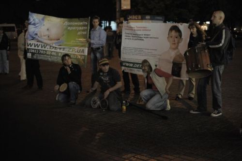Два часа не замолкали барабаны, два часа несмотря на дождь и ветер не сворачивались плакаты с призывами помочь запорожским детям, два часа прохожие могли почитать информацию о Владике на листовках и внести свой, пусть даже небольшой вклад, в спасение жизни мальчика.