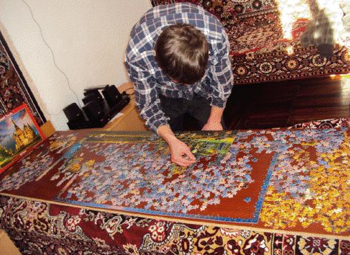 а этот воспитанник собирает пазлы огромных размеров, после чего клеит их на бумагу и развешивает по всему отделению