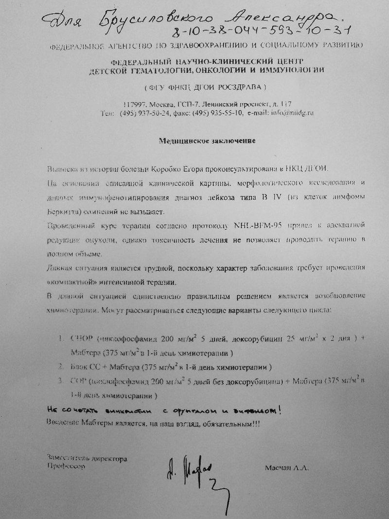 Сейчас мальчик уже в палате - теперь у него обнаружили воспаление легких! Впереди еще долгое лечение, тяжелые блоки химиотерапии, лечение кишечника.. А семья - очень бедная!!! Только бабушка со своей мизерной пенсии и брат - со своей маленькой зарплаты могут передать немножко денег, но их вообще ни на что не хватает! А мальчику нужно хорошее диетическое питание, дорогостоящие лекарства, игрушки и вещи.