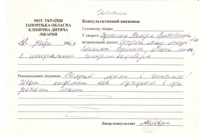 Лера проходит лечение в отделении гематологии Запорожской областной детской больницы (просп. Ленина, 70, 5-й этаж) - тел. +3 8 061 222-21-50