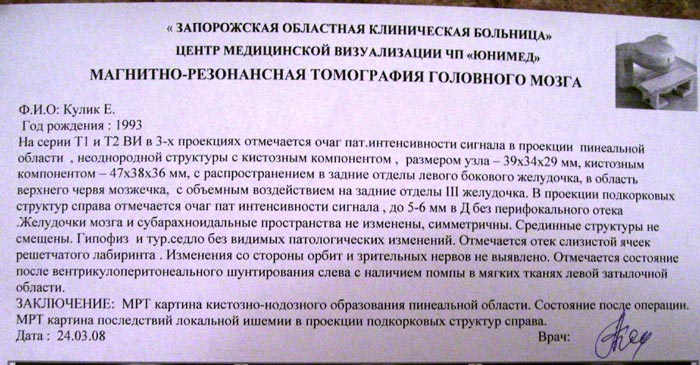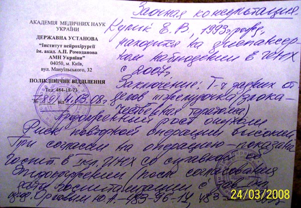 Мальчика срочно направили в Киев в институт нейрохирургии. Там сразу же поставили шунт для оттока жидкости, чтобы хоть как-то облегчить состояние Жени. У Жени снизились зрение и слух. 15 декабря проведена операция по частичному удалению опухоли. Женю в тяжёлом состоянии перевозят в Запорожье. В январе в Запорожском онкодиспансере мальчик начинает проходить курсы лучевой терапии, но состояние продолжает ухудшаться. 14 марта у Жени онемел язык, щёки, и мальчик чуть не задохнулся на глазах у матери. Мальчика госпитализировали в отделение хирургии ЗОКДБ, 23 марта сделали очередное МРТ обследование. К сожалению, результаты неутешительны – несмотря на проведённые 2 курса лучевой терапии, опухоль не только не уменьшилась, но даже несколько увеличилась, задевая некоторые жизненно важные центры мозга. Женя борется, пытается сам сидеть, произносить слова. Врачи оценивают состояние больного как тяжёлое, предполагают опять ехать в институт нейрохирургии в Киев, возможно там сделают повторную операцию и назначат другое лечение. Татьяна Николаевна, кроме Киева, хотела бы проконсультироваться в Москве и, возможно, пересмотреть результаты гистологического анализа опухоли.