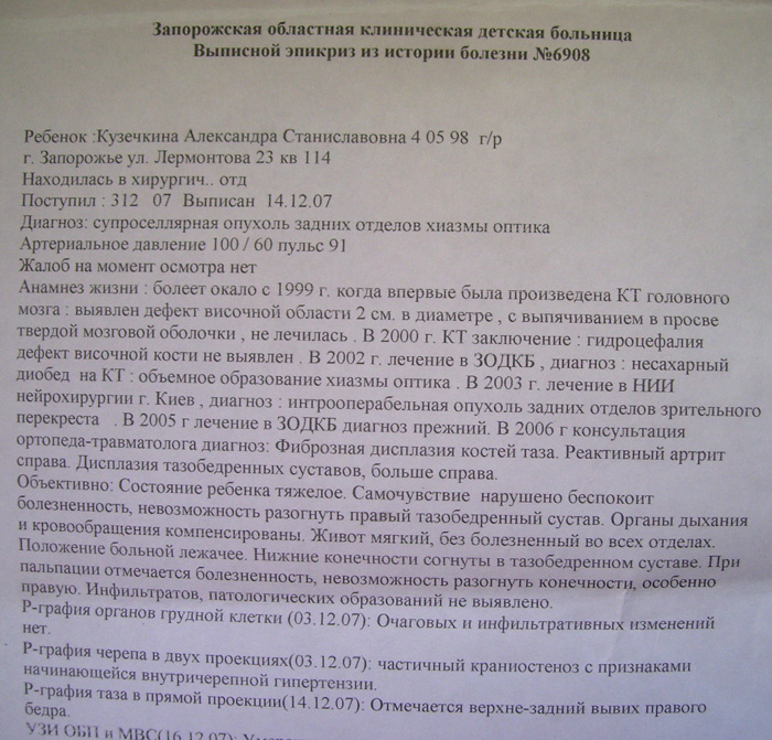 Александра – единственный, дорогой и любимый ребенок в семье. На первом году жизни девочка ничем не болела, ничто не предвещало беды. Но судьба распорядилась иначе. Когда Сашеньке исполнился годик, её самочувствие по необъяснимой причине ухудшилось. Было сделано МРТ обследование головы, в результате которого обнаружено отверстие в костях черепа размером 2 на 1,5 см. Врачи предложили операцию - установку пластины в костях черепа. Лена, мама Саши, от операции отказалась, т.к. было неясно, что произойдёт с пластиной и черепом в процессе роста ребёнка. Родители обратились к знахарю, и после лечения у него томография показала, что отверстие исчезло. Однако проблемы на этом не исчерпались. В 2002 г. Сашенька начала резко терять в весе. Обследование показало синдром несахарного диабета и анемию. В качестве причины этих заболеваний врачи предполагали опухоль головного мозга. В 2003 году девочка обследовалась в институте нейрохирургии г. Киева. Тогда операцию отложили в связи с тяжелым состоянием ребенка.