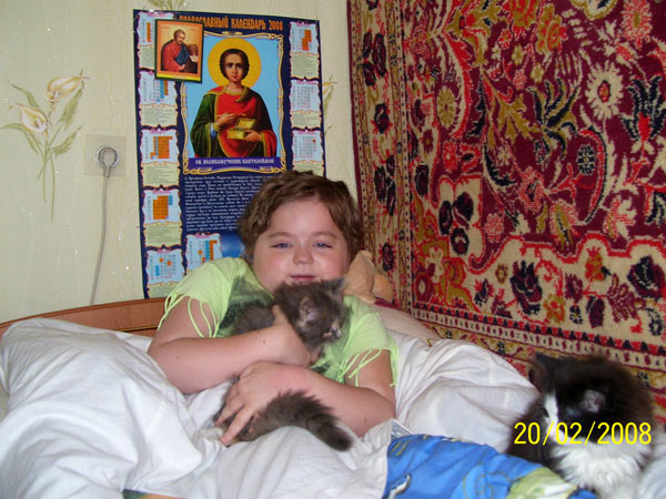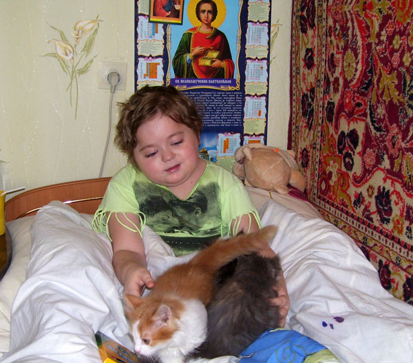 Пока я общался с Леной, её дочь Сашенька лежала на кровати и играла со своими домашними любимцами – кошками. В квартире Саши проживает аж 6 этих очаровательных мурлыкающих созданий. Кроме игр с животными, Саша любит рисовать, разукрашивать раскраски, складывать пазлы и вырезать что-то из бумаги. К сожалению, болезнь лишает эту добрую, не в чём не повинную девочку даже этих радостей. С августа 2007 Саша перестала бывать на улице – усиливающиеся боли в тазобедренном суставе лишили её возможности самостоятельно передвигаться. Малейшее движение причиняет девочке адскую боль.