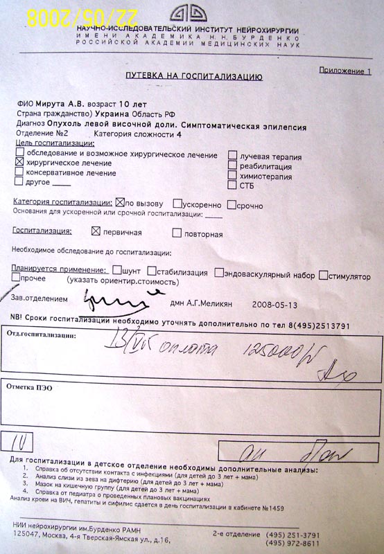 В середине мая Светлана, мама Саши, ездила на консультацию в Киев и в Москву. В обоих местах было рекомендовано хирургическое лечение и по результатам гистологического анализа опухоли – определение дальнейшей тактики лечения. Наш опыт работы с детьми, имеющих онкозаболевание мозга, показывает, что уровень украинской нейрохирургии всё-таки ниже российского (об этом говорит печальная участь большинства детей с подобным заболеванием, проходивших лечение на Украине). Официальная стоимость операции в Москве, в институте нейрохирургии им. Бурденко составляет $5000 (125 000 рос. рублей). Данная клиника готова принять Сашу на лечение прямо сейчас. Таким образом, в кратчайшие сроки семье Саши Мируты необходимо найти сумму на лечение, проезд и проживание в Москве. Мама Саши воспитывает двоих сыновей без отца, работает оператором ЭВМ на «АвтоЗАЗе». Думаю, что собрать в кратчайшие сроки необходимую сумму вполне по силам сотням неравнодушных людей – посетителей этого сайта.
