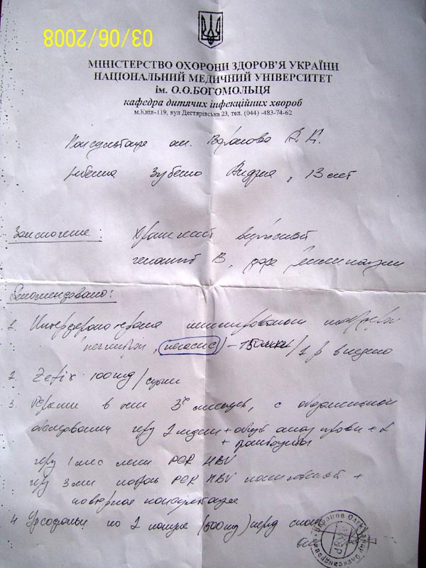 На кафедре детских инфекционных болезней в университете им. О.О.Богомольца в Киеве, где Андрей консультировался, ему была назначена восстановительная терапия, а также расписано лечение гепатита на 6 месяцев. Для того чтобы Андрюше пролечить гепатит, были выписаны эффективные, но дорогостоящие препараты Пегасис и Зефикс. Также постоянно нужны поддерживающие иммунитет витамины.