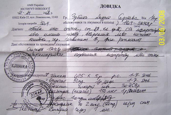 Справка о необходимых препаратах из института онкологии (г.Киев)
