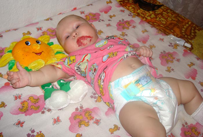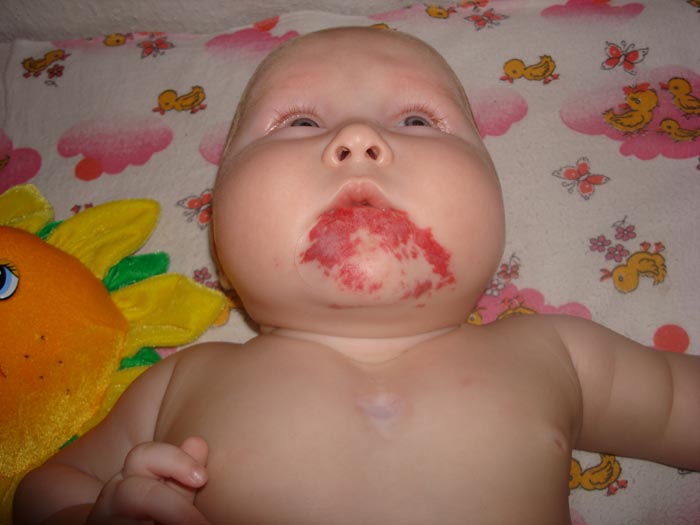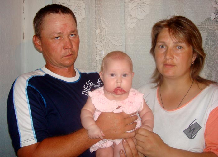 Дашенька родилась совсем недавно – 1 апреля 2008 года в посёлке Андреевка Бердянского района Запорожской области. Несмотря на то, что первое апреля – для большинства людей день радостный и почти праздничный, для Дашеньки и её семьи с первого дня появления на свет начались нелёгкие испытания. Вес и рост девочки были в норме, но первые наблюдения за ребёнком показали наличие патологий развития: - гипоплазия трахеи, дисплазия верхней трети грудины, множественные гемангиомы (красные пятна – доброкачественные сосудистые опухоли) подбородка, нижней губы, слизистой полости рта и языка.