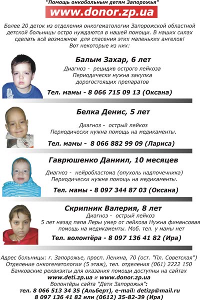 P. S. На днях пересматривала сюжеты о нашей акции "Улыбка против болезни" на телеканалах и стало немного стыдно за слова "Проблемы запорожских больных детей волнуют только иностранцев". Последний месяц показал, что в Украине и Запорожье достаточно много неравнодушных людей, готовых помогать детям. И только от нас зависит, сможем ли мы, объединив усилия всех запорожцев, спасать своих детей.