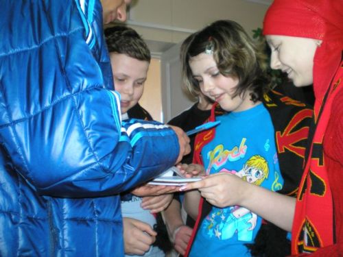 А уже когда футболисты оделись, чтоб уходить, детвора «очухалась» от первого радостного шока и кинулась брать автографы (мой рабочий блокнот первым пал жертвой – под автографии из него выдрали чуть не половину листочков), а так же фотографировать футболистов на мобилки.