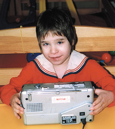 Мы смотрим видеозапись: Чудесный солнечный день 4 июня 1995 года. На экране Наташа, Ирина Самсонова и Сергей Колосков в парке рядом с Тушинской больницей. Ирина рассказывает: Наташа, когда была сюда привезена, была очень маленькая... Даже не оттого, что она сейчас выросла, а оттого, что она была, как крючочек... ножки у нее и ручки были, – я даже померила, – вот сложить два пальчика вот так и приложить к ножке – вот это была толщина ее ноги. Пальцы были, как у пианиста, то-о-нкие, ручки то-о-нкие, и любое прикосновение к ней доставляло ей неприятные, болезненные ощущения, и поэтому вначале приходилось ее очень осторожно, как цветочек брать, и такими легкими прикосновениями поглаживать, качать. Наташа очень любит яблоки, даже больше, чем бананы, она любит яблоки. Банан был первым фруктом, который она съела непротертым. Банан мягкий, и она сначала его разминала языком. Банан прилипал к небу, и она вынуждена была языком двигать и таким образом совершались первые жевательные движения. Потом рискнули дать ей хлеба немножко, пряники. Теперь мы едим все, нас перевели уже на общий стол и мы кушаем все самостоятельно, сидя за столом, как взрослые дети – ложкой из тарелки.