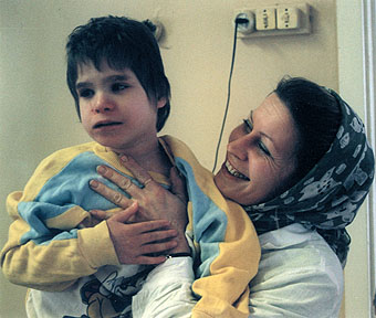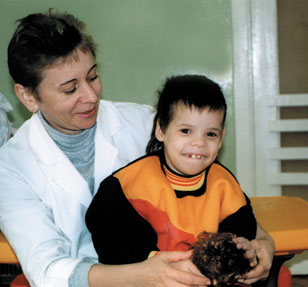 Рассказывает руководитель группы санитаров-воспитателей Леонид Могилевский: “Цель нашей работы — создать этим детям такую среду человеческих отношений, которая была бы максимально приближена к семейной. В такой среде дети имеют больше шансов для развития своих человеческих возможностей”. Переодевая или купая ребенка, во время игры, кормления, других занятий, санитары-воспитатели стараются относиться к нему так, как относятся к своим детям родители в обычной семье. Любое действие обязательно сопровождается ласковым прикосновением, обращением по имени, улыбкой, контактом “глаза в глаза”. Работа постепенно расширялась. Если в январе 1996 года в интернат приходили всего несколько человек, которые ухаживали за 35 детьми, то к осени 1996 количество детей в отделении удвоилось, и появилась необходимость увеличить число санитаров-воспитателей. В начале 1997 года был заключен договор между интернатом и Ассоциацией Даун Синдром о создании отделения милосердия и реабилитации. Благодаря этому появилась возможность пригласить в отделение сверхштатных врачей: психиатра, психоневролога, имеющего опыт работы с детьми с диагнозом ДЦП и педиатра. Примерно с этого времени работа начала строиться так: каждый день со 100 детьми работает смена из 13-14 санитаров-воспитателей (по одному на группу 7-8 детей). Воспитатели хорошо знают “своих” детей — все их особенности, симпатии, слабости. Постепенно такое общение стало приносить свои плоды: дети начали оживать в прямом смысле этого слова, у них появился интерес к жизни.