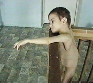 Ирина: Нет, никаких снотворных ей не давалось. Успокаивающих тоже не давали никаких средств. Ну поначалу, когда мы с ней занимались, занятия собой представляли, естественно, гигиенические процедуры, кормление, и мы старались как можно больше носить ее на руках. Мы носили ее на руках, пели песенки, причем разные, как выяснилось. Леня поет другие песни. А мы ходили с ней и пели: "Жили у бабуси два веселых гуся". Да, вот она уже сразу узнала. Да, Наташа. Вот эту песенку мы с тобой пели все время. И она начала подпевать. Это было очень удивительно. Это, конечно, со стороны, может быть, трудно назвать пением, но, тем не менее, это было мне понятно, что она подпевает, она участвует в этом процессе. И вот, видимо, этот близкий, непосредственный контакт – выражение нашей к ней любви – и позволил ей как-то войти в нормальное русло, начать поправляться. Сложности у нас были также и в том, что она очень просила есть, и поначалу когда ее кормили, она не хотела останавливаться: сколько ей дашь, столько она и съест. Это приводило к поносу. В дальнейшем, уменьшив порцию, удалось нормализовать стул. Она начала поправляться – начало появляться "тело". И тогда можно было уже переходить к более целенаправленным действиям по укреплению костно-мышечной системы, по общему развитию. Приходил логопед, показывал упражнения. Поскольку они касались только рук и лица, она позволяла, в общем-то, заниматься этим. Сначала болезненно для нее это было. Ну, а теперь она проделывает эти упражнения с удовольствием. Потом, когда она немножечко набрала вес и стала весить больше 10 кг, тут уже включились в работу специалисты по массажу и лечебной физкультуре. Показали ряд упражнений, которые она сначала восприняла очень напряженно, болезненно, потому что действительно прикосновения к ней доставляли ей просто физическую боль. Но, тем не менее, руки и ноги начали развиваться, Наташа стала сама садиться и потихонечку вставать. И теперь она сама уже ходит, держась за один палец. А недавно она порадовала нас тем, что отпустила ручки от кровати и подошла ко мне, проделав два-три шага самостоятельно. Это была, конечно, для нас большая радость. Почему для нас. Потому что каждый ее успех очень горячо воспринимается всеми, кто рядом с ней находится, живет. Это и дети, это и персонал больницы. Вообще, находясь рядом с Наташей, ощущаешь, как много в мире прекрасных людей – добрых, отзывчивых, внимательных. Одни прекрасные люди нашли Наташу, другие – взялись ее лечить, третьи – приносили вещи. Ведь она была привезена фактически без одежды, на ней были только зимнее пальто, свитер, шапка и носки и больше ничего на ней не было. А теперь она, как хорошая невеста, с большим приданым. И все это не было куплено только нами в магазине, а было принесено многими людьми. Причем, очень интересно... Так вот, я хотела рассказать про вот эти носочки. Их подарила девочка, которая эти носочки купила на первую свою зарплату, как она сказала. Она помогала своим родителям и работала диспетчером на телефоне и свою первую зарплату она решила истратить и купить Наташе эти носочки и очень просила, чтобы их ей надевали, чтобы Наташа ее помнила. А зовут эту девочку Ирочка. А ей всего лишь одиннадцать лет! Она связала Наташе жилеточку. И это были первые обновки. А потом, с ее легкой руки, стали люди приносить другие вещи. И теперь она у нас оде