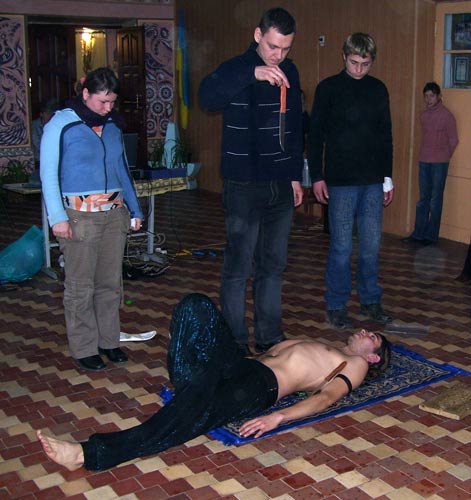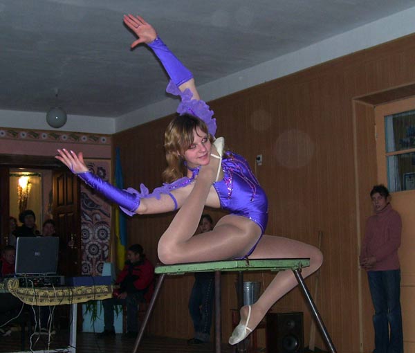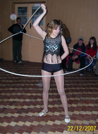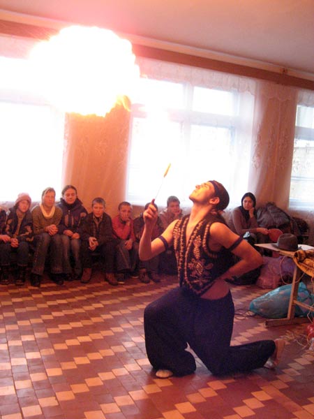 Вика произвела неизгладимое впечатление на ребят своей гибкостью и трюками, показанными в далеко не самых простых условиях (н-р, температура воздуха в спортзале Черниговского интерната составляла 8-10 градусов тепла).