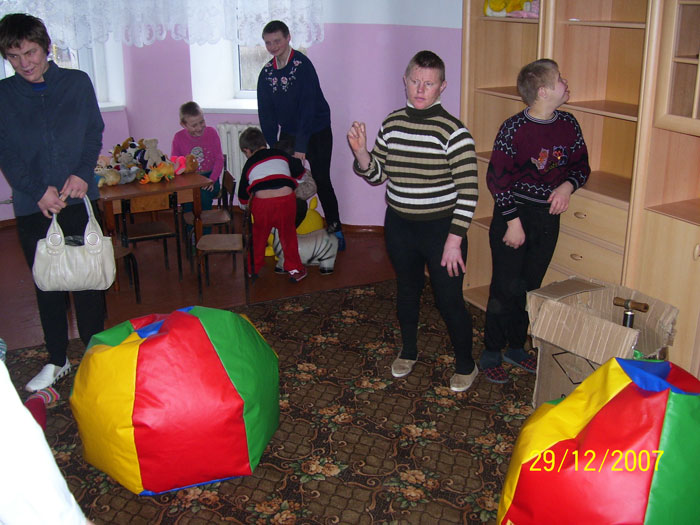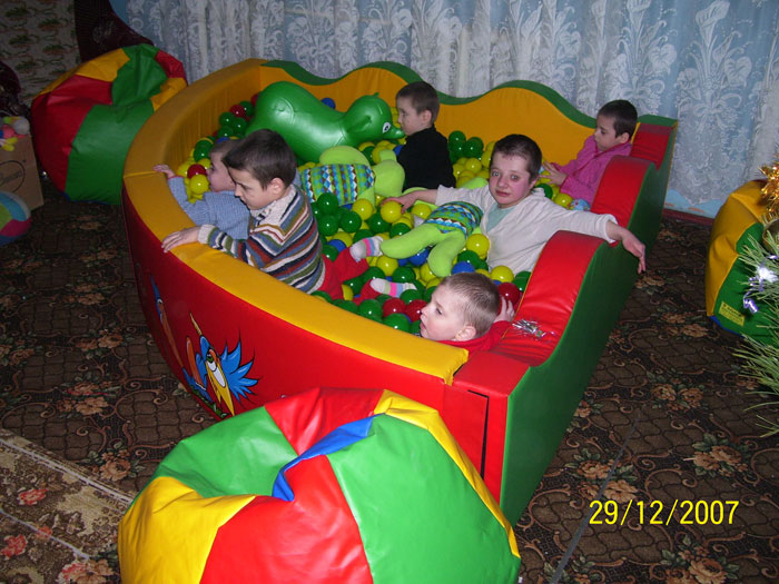 Наконец, мы в Калиновке. Нас любезно встречает Николай Викторович Славов, директор детского дома. Сразу же занимаемся выгрузкой и сборкой сухого бассейна и надуванием резиновых животных в корпусе для «лежачих» деток. Спонсоры для закупки сухого бассейна, больших мягкий пуфиков, канцтоваров были найдены благодаря усилиям Марьяны, Тани, Лиины из Киева (все – участницы форума likar.info), а также Ани из Голландии. Волонтёры передали также телевизор Sony, DVD и кассетный видеомагнитофон. Стоимость одного только сухого бассейна – около 5000 гривен, всего же было передано подарков на сумму более 10 000 гривен. Огромное спасибо всем – и спонсорам, и волонтёрам.
