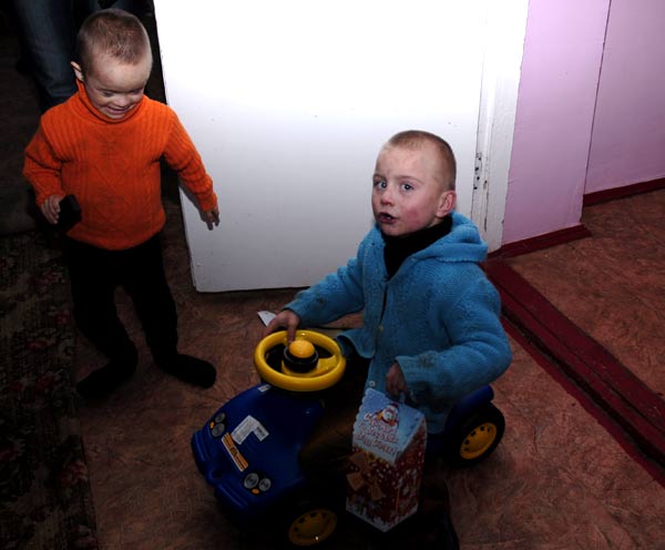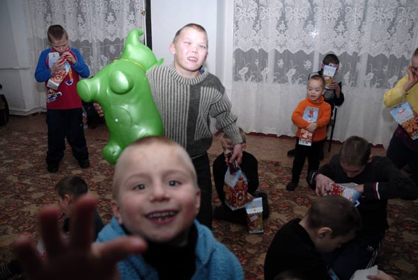 За два дня до Нового Года, 29 декабря 2007 года мы вновь побывали в Калиновке. В поездке участвовали запорожская фотохудожница Ромашка, Сергей (водитель авто) и автор этих строк, Альберт Павлов. Ромашка, проведя накануне благотворительную выставку-продажу картин, вырученные средства направила на покупку подарков для детей. На сумму около 2100 грн. мы закупили 10 надувных резиновых животных, яркие книжки, шарики и 160 сладких новогодних подарков.