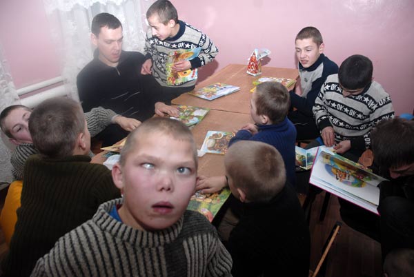 Поиграв с детками в бассейне, мы направились в корпус для мальчиков 4-17 лет. Здесь мы решили попробовать заниматься с детьми – читать книжки, пообщаться в небольшой компании. Конечно, мы прекрасно осознавали, что лишь небольшая часть детей способна хоть как-то понимать услышанное. Ведь у многих стоит диагноз «Идиотия» (полное отсутствие речи и мышления) или «Имбецильность» (средняя степень интеллектуального недоразвития).