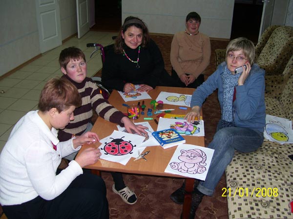 В это время Марьяна занималась изготовлением бус и зарисовкой раскрашек с группой девочек, а Саша- реабилитолог делал массаж в корпусе для «лежачих».