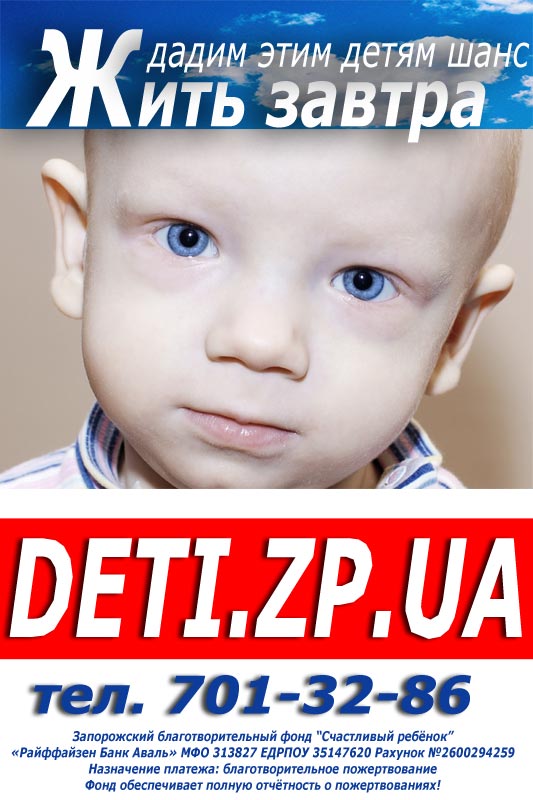 Мы обращаемся ко всем, кто в той или иной степени связан со СМИ и размещением рекламы в нашем городе и области. Благодаря вашей информационной поддержке сайта www.deti.zp.ua тысячи запорожцев, желающих делать добро, но не знающих как, смогут помогать не только профессиональным нищим, но тем, кому действительно нужна помощь. Сотни больных детей при этом получат шанс на жизнь, многие сироты найдут семьи, а детские больницы получат новое оборудование. Но самый главный результат вашей поддержки в том, что люди задумаются о действительно наиболее важных вещах, ради которых стоит жить и работать.