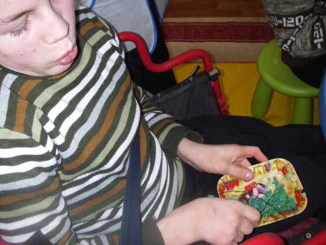 «Сегодня мы решили сделать сирень,” - объясняет Лиля, руководитель кружка. “Сначала я показывала ребятам, а сейчас они уже сами знают, как сделать листик или лепесток. Сами отсчитывают нужное количество бисера». Мой взгляд останавливается на Алеше, парне, страдающем тяжелой формой ДЦП, каждое целенаправленное движение дается ему с трудом. Вспоминаю, как летом он описывал рукой круг в воздухе, чтобы сорвать колосок у дороги. А сейчас, он нацеливает проволочку и ловко поддевает бисеринку, лежащую на блюдце перед ним. Что там одна бисеринка - он с гордостью демонстрирует целую веточку, которую сделал сам! Лиля перехватывает мой взгляд «Я не могла даже предположить, что Алешка сможет этим заниматься. Никто не может до сих пор поверить. А ему так нравится!»