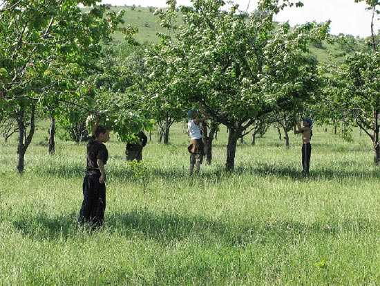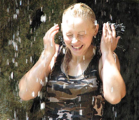 На второй день был радиальный выход на водопад Су-Учхан недалеко от Красной пещеры. Попутно ребята совершили набег на заброшенный черешневый сад. Перед нами во всей красе простиралась Долгоруковская яйла и все бы так и продолжалось, если бы идиллию не нарушил шлагбаум и большой дядя возле него. Осмотр любой красивой достопримечательности Крыма даже естественного происхождения стал объектом бизнеса предприимчивых жителей. И, тем не менее, дорогу к водопаду нам открыли. К счастью, красота водопада, холодная чистая вода и возможность искупаться окупили все наши усилия:). В чашу молодости окунулись практически все, а некоторые взобрались гораздо выше! То и дело раздавались возгласы мальчишки, который каждый раз взбирался по камням все выше. И каждый раз требовал признания своей смелости. Как по мне, так типично мужская черта характера!