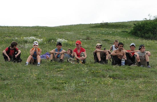 После организации лагеря и первого завтрака (кто сказал, что соль – это яд? На мой взгляд, каша без соли – еще большая отрава!) было принято решение отдыхать до вечера. И, тем не менее, большая часть ребят все же согласилась прогуляться на яйлу, особенно после обещания Влада (гида) показать пещеры. Кепки на голову, фонарики в карман и подъем по Красной тропе состоялся. Вот тут-то и проявилась их сила и выносливость. Несмотря на отсутствие акклиматизации, ребята почти в полном составе взбежали по подъему. Наверное, чтобы потом отдыхать на плато, свысока наблюдая за отставшими:).