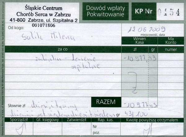 P.S. Надеемся, Вы уже получили копию квитанции из клиники. Там указана сумма только за операцию - 10977 польских злотых. Если в долларах, то это 3.5 тысячи долларов. Всего же поездка нам обошлась в 6 тысяч долларов, если не учитывать мелкие расходы, которых, правда, было много.