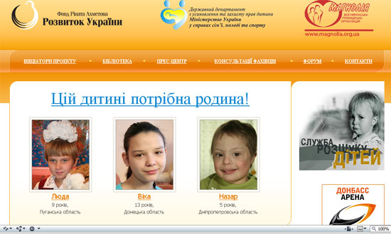 Фонд Рината Ахметова «Развитие Украины» совместно с Государственным департаментом по вопросам усыновления и защиты прав ребенка и Всеукраинской общественной организацией «Магнолия» запустили первый национальный Интернет-портал по вопросам усыновления «Сиротству – нет!». Портал впервые в истории Украины открыл потенциальным родителям доступ к информации о детях, подлежащих усыновлению.