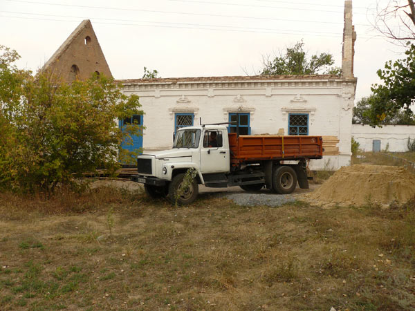 Строители разгружают первую партию досок (для покрытия чердака и обрешётки под кровлю). Всего закуплено 22 куб м. досок и балок на сумму около 30 тыс. гривен)