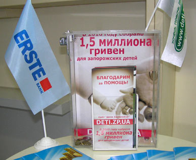 С 2009 года клиенты ERSTE банка пожертвовали 12 626 гривен в ёмкости, установленные фондом «Счастливы ребёнок» во всех отделениях Запорожской области. Кроме того, сотрудники банка периодически проводят сбор средств на нужды больных детей внутри коллектива. В результате недавней такой акции 1120 гривен было перечислено на лечение Кристины Войтович. Кроме того, работники банка собирают игрушки для организации передвижной развивающей игровой комнаты в детских домах нашей области.