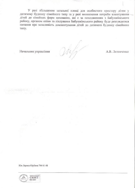 Ответ службы по делам детей о необходимости расширить жилую площадь: стр.1 стр.2