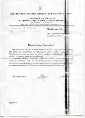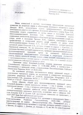 “Спустя некоторое время после того, как я взяла одну из дочек, ко мне предъявила интересные претензии Прокуратура. Узнав, что я состою на государственной службе, она обвинила меня в коррупции, мотивируя это тем, что я получаю пенсию дочери, так как она потеряла родного отца в шахте (Ст 256-3.4 Семейного кодекса Украины – прим. автора). Это говорит о том, что наши следователи не знают законов, конечно, обвинение было снято, потому что в Семейном кодексе указано, что родители приемной семьи – законные представители приемных детей” (Ст. 256-2. 4 Семейного кодекса Украины – прим автора).