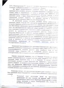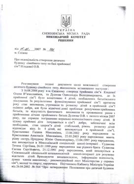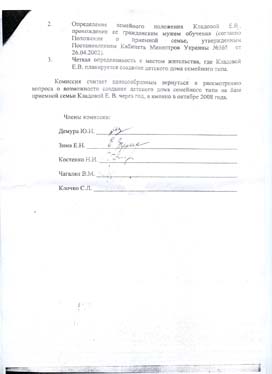 Но Комиссия от Донецького обласного совета во главе с Юрием Демурой, заместителем председателя постоянной комиссии по вопросам науки и образования Донецкого областного совета, к этим аргументам не прислушалась, даже наоборот. Ее члены, приехав и ознакомившись с ситуацией, также порекомендували Исполкому вернуться к рассмотрению этого вопроса позднее, т.к. нужно, чтобы Алена Кладова и ее гражданський муж выполнили определенные условия. А именно: успешно воспитывали детей на протяжении трех лет (а в это время сестра одной из приемных дочерей будет продолжать расти в интернате – прим. автора); определились с семейным положением (хотя по нашому законодательству создать дом семейного типа может и один родитель, да и гражданський брак приравнивается к официальному – Ред.). Им также надо определиться с местом жительства (как с ним можно определиться, когда деньги на жилье для будущого детского дома семейного типа должны бать заложены в городском бюджете, и покупать его должна должна Служба по делам детей? – Ред.). К тому же, Родиону необходимо пройти месячные курсы приемных родителей (это действительно дело одного месяца).