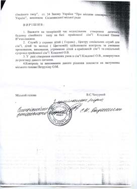 Статус дома семейного типа по нашим законам дает Исполком города областного или республиканского значения, в городе Снежном его главой является мэр. Городской Исполком отклонил прошение Кладовой об организации детского дома семейного типа на том основании, что для этого не создано необходимых условий, так как приемные родители развелись, приемный отец не воспитывает детей, и морально-психологическое состояние детей ухудшилось.