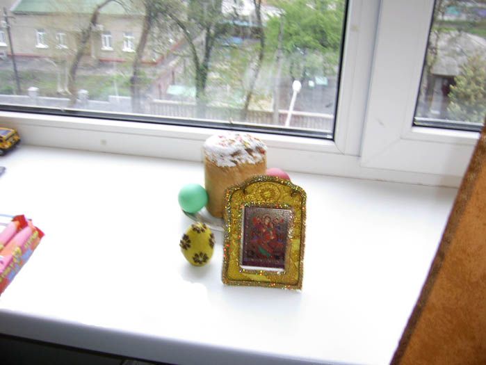 А это хозяин подоконника Стратий Данилка, 7 лет, саркома бедра. Он не выходил на утренник, лежал под капельницей. Мы его поздравили в палате. Яйцо украшал и делал рамочку к иконке он сам (чуть-чуть помогала мама) на наших занятиях арт-терапии.