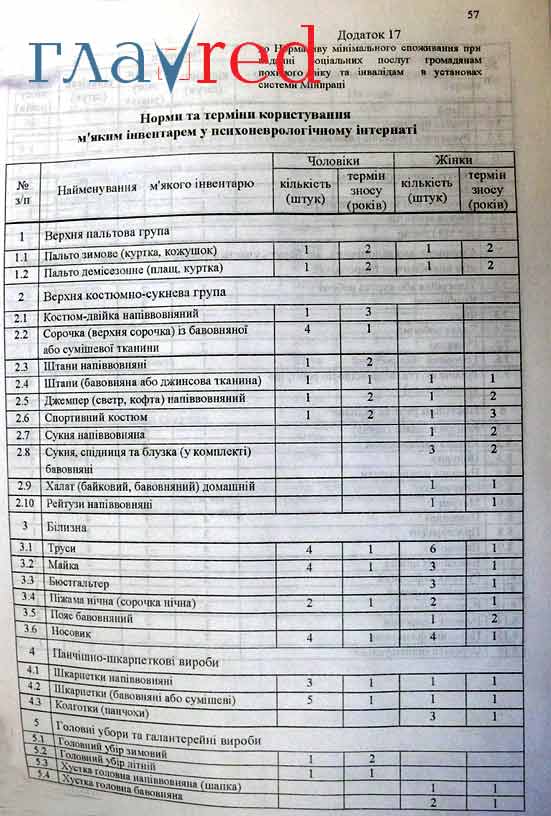 За «Нормами та термінами користування одягом і взуттям у дитячих будинках-інтернатах», наприклад для хлопчиків «положено» дві пари вовняних і чотири пари бавовняних шкарпеток на рік, для дівчаток відповідно три й одна. Дівчаткам – одна вовняна спідниця на два роки, хлопчикам – один костюм на той самий термін. Хлопчикам «положено» три майки на рік, дівчаткам – ні. Зате всім «положено» по 6 трусів на рік, не більше. Натомість цифра «6» з’явилася у «Нормах» 2006 року, коли Мінсоцполітики вирішило внести зміни у документ, а Міністерство фінансів зі скрипом погодилося ці зміни профінансувати. До цього часу на одну людину в інтернаті видавали тільки 2 трусів. ...У Знам’янці, як і в більшості і дитячих, і дорослих інтернатів у країні, проблем з кількістю одиниць одягу на одну дитину немає – допомагають меценати, які забезпечують більш-менш хорошим уживаним одягом з Європи.