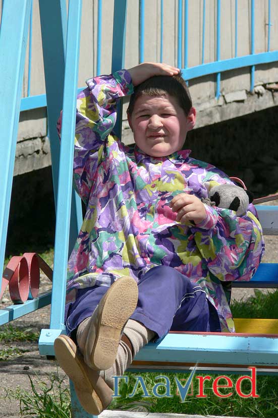 Коли сонячна тепла погода, діти бавляться на подвір’ї будинку-інтернату (III-IV профіль). На візку – 11-річна Юля (Знам’янський дитячий будинок-інтернат)